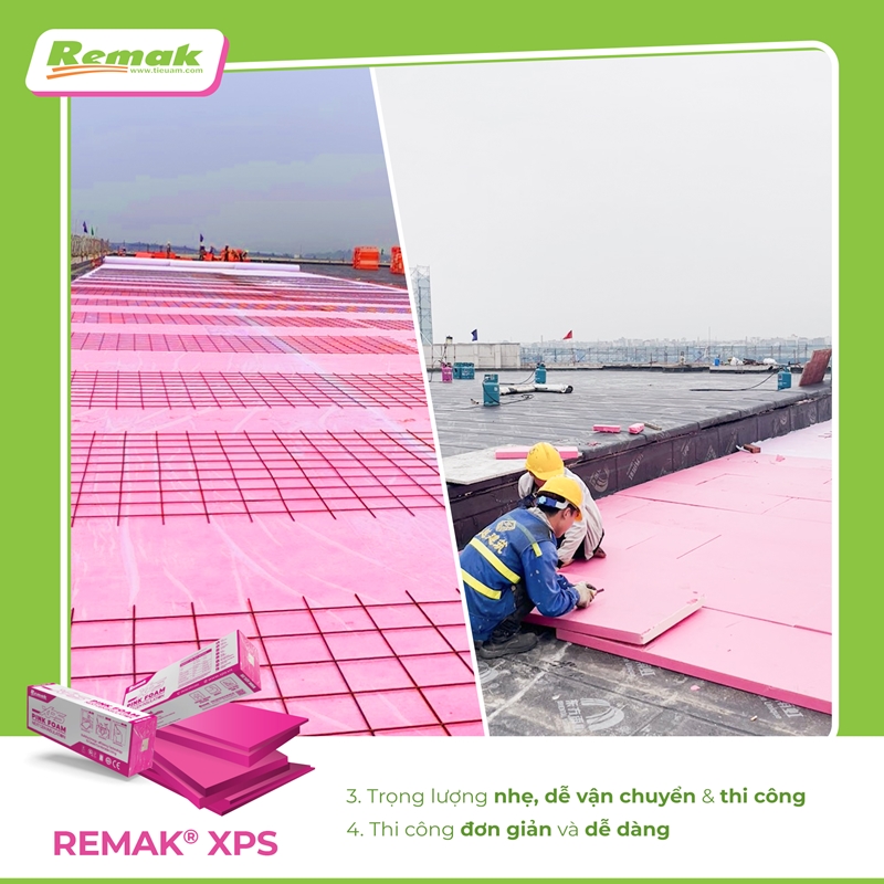 Trọng lượng siêu nhẹ giúp quá trình vận chuyển vật liệu đến công trình đơn giản hơn, nhanh chóng hơn và tiết giảm chi phí đáng kể. Dòng Remak® XPS siêu nhẹ (tỷ trọng thấp) đặc biệt được yêu thích trong cách nhiệt tường, mái, trần vì chúng góp phần làm giảm tải trọng cho kết cấu và gia tăng độ bền cho công trình.