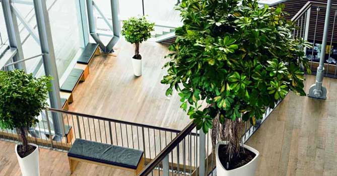 Indoor plants have numerous benefits, including improving air quality and adding natural elements to sterile environments; but they can also reduce office noise. Stems, leaves and branches all absorb sound. They are also flexible and can deflect and refract sound.