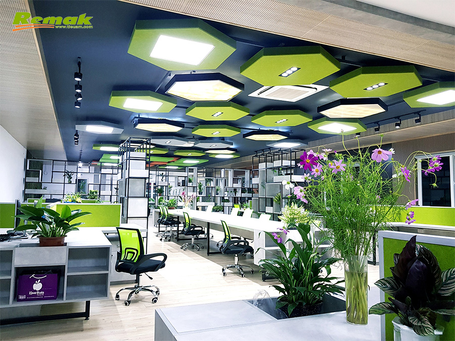 + Sử dụng thực vật và các loại cây bụi làm vách ngăn tự nhiên trong văn phòng có không gian mở. Thay vì các vách ngăn thô cứng thiếu tính thẩm mỹ, bạn cũng có thể cân nhắc đặt những tán lá -Tấm tiêu âm trang trí Acoustic Sonic Jungle Wall trên tủ hồ sơ, trên bàn làm việc hoặc trên tường để tạo ra một hàng rào hấp thụ âm thanh 3 trong 1, vừa như vật trang trí, vừa tạo không gian riêng tư giữa các khu vực, và quan trọng giúp chất lượng âm thanh trong phòng được cải thiện rõ rệt.