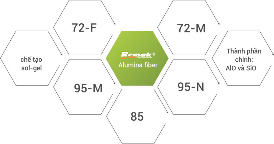 Bông Remak® Alumina chủ yếu được cấu tạo từ nhôm oxit (Al₂O₃) và silic oxit (SiO₂), được sản xuất bằng phương pháp "sol-gel" tiên tiến hàng đầu thế giới. Bông sợi nhôm Alumina có độ linh hoạt cao, khả năng cách nhiệt và chịu lửa vượt trội. Dựa theo hàm lượng và pha tinh thể của nhôm oxit chúng tôi chia làm 4 dạng sản phẩm chính: 72-F; 72-M; 85; 95-M; 95-N.