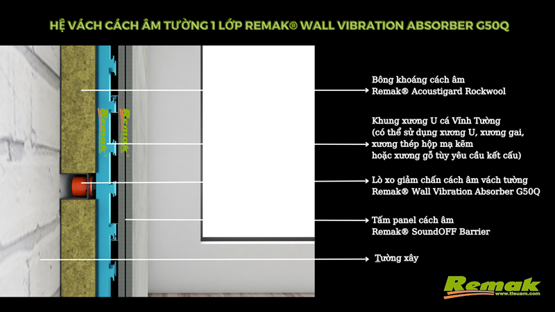 Lò xo và bông khoáng do Remak tự sản xuất, cung ứng kết hợp thành hệ tường vách cách âm 1 lớp Remak® Wall Vibration Absorber G50Q – giải pháp vừa kinh tế, vừa hiệu quả trong việc cách âm, chống rung, triệt tiêu âm thấp tần, khử bass. Hệ vách tường cách âm này giảm tiếng ồn truyền qua kết cấu tường lên đến hơn 45dB. Chúng được ưa chuộng từ các công trình nhà ở dân dụng, công trình công cộng, công nghiệp, thương mại, quán karaoke, quán bar, vũ trường, sàn nhảy, nhà hàng... cho đến phòng cách âm gia đình, phòng giải trí, phòng làm việc... v.v...