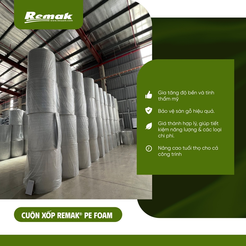 Cuộn xốp Remak® PE Foam loại thường màu trắng, loại tráng nilon HDPE, loại tráng bạc OPP kích thước 2mm x 1m x 150m và 3mm x 1m x 100m là vật liệu quan trọng không thể thiếu khi thi công lót sàn gỗ. Đặc biệt, tất cả các sản phẩm của Remak đều đạt chứng chỉ ISO 9001:2015 và được tối ưu hóa để chuyên dụng cho các loại công trình từ phổ thông đến cao cấp.