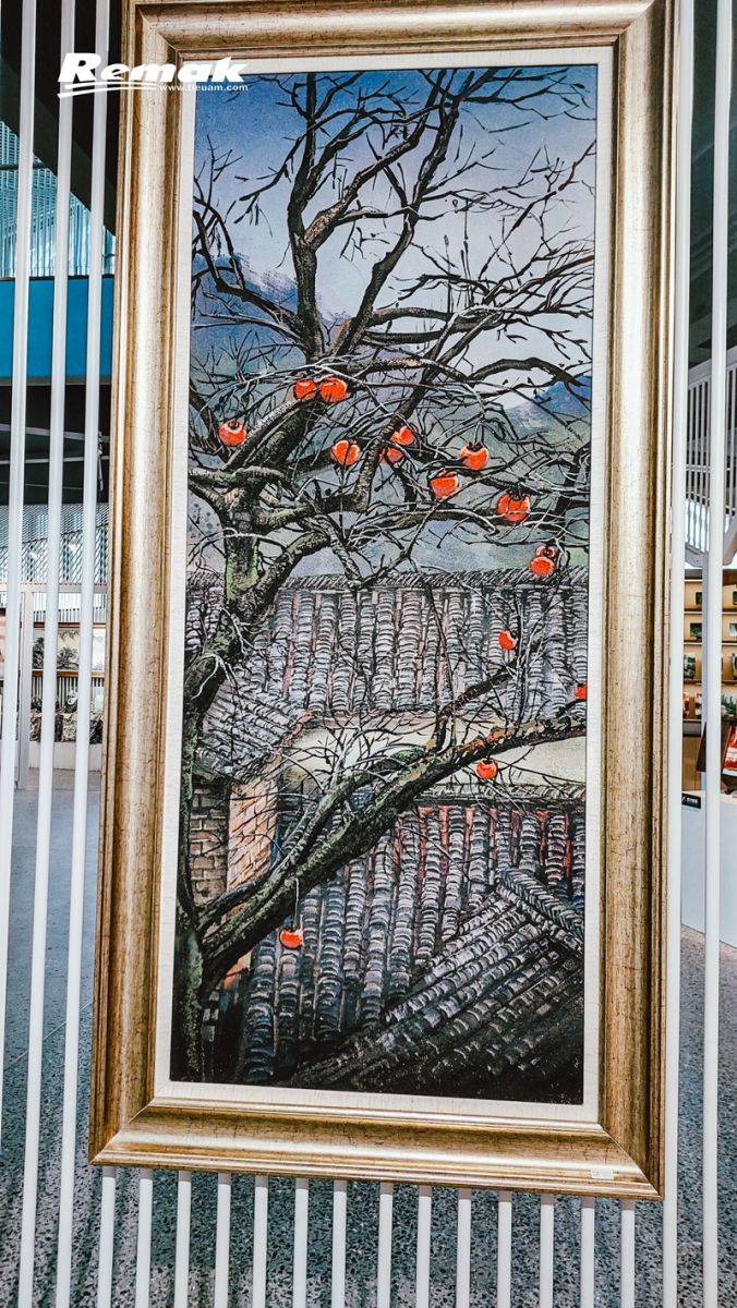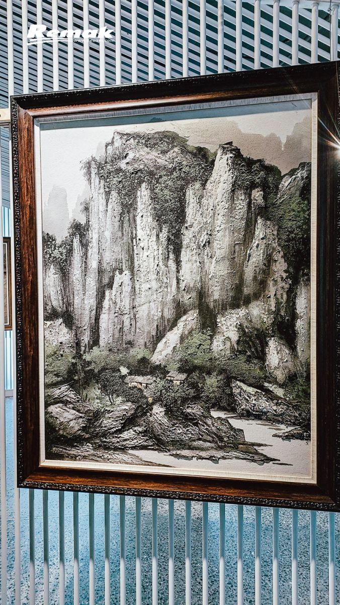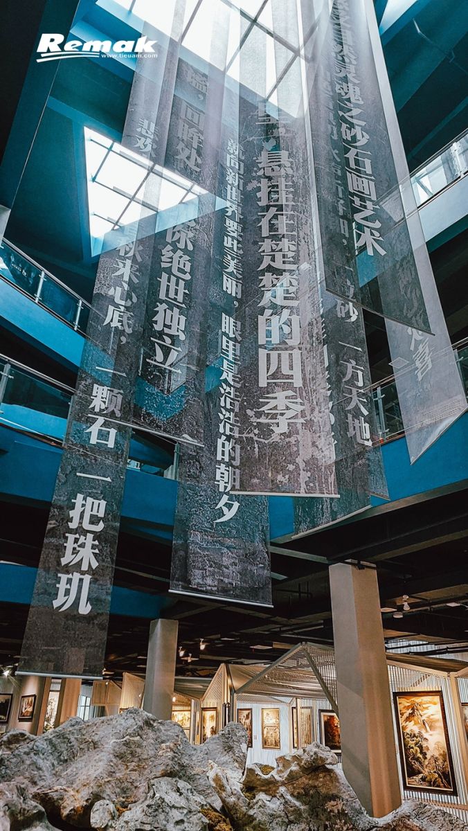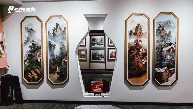 Không gian tinh xảo, đầy chiều sâu với các bức tranh được tạo hình bằng cát cùng những nguyên liệu tự nhiên như đá, sỏi, tre, trúc, thực vật... v.v... tại Họa viện Quân Thanh