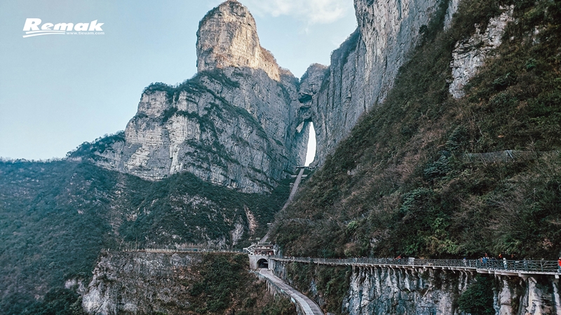 Trong khi đó, với chiều dài 11km cùng 99 khúc cua hiểm trở, Thiên Môn Sơn (nằm ở vườn quốc gia Thiên Môn – Trương Gia Giới) – Top ngọn núi nổi tiếng nhất xứ Trung được mệnh danh là một trong những cung đường nguy hiểm và khó chinh phục bậc nhất. Đoàn Remak đã có một buổi chiều đáng nhớ khi di chuyển bằng cáp treo gồm tất cả 98 cabin có tổng chiều dài 7.455m để đặt chân lên "cổng trời". Nhiệt độ giảm trung bình 10°C so với TP. Trương Gia Giới và bồng bềnh mây phủ. Con đường trong suốt Skywalk được làm từ kính cường lực, ôm sát vào vách đá dựng đứng, đem lại cảm giác thích thú xen lẫn hồi hộp. Cùng với đó là không khí trong lành, thoáng đãng; sắc trời xanh biếc; khung cảnh hùng vĩ trập trùng của non nước hữu tình... dễ dàng gợi nhớ đến hai câu thơ tuyệt tác của Chủ tịch Hồ Chí Minh: “Cao sơn hữu ý thiên niên bút/ Lưu thủy vô thanh vạn cổ cầm.” (Núi cao có ý như cây bút ngàn năm/ Nước chảy không nghe tiếng nhưng lại là cây đàn muôn thuở).