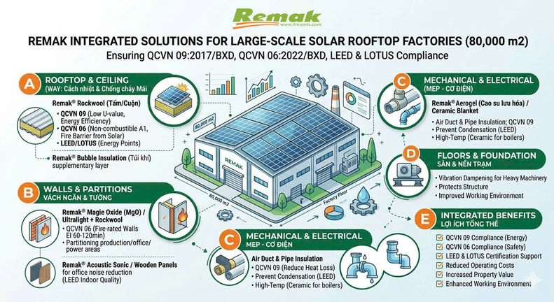 Điều này đặt ra yêu cầu cấp thiết về một hệ giải pháp vật liệu đồng bộ, không chỉ đảm bảo hiệu quả cách nhiệt mà còn phải đáp ứng các tiêu chuẩn về an toàn cháy nổ và hiệu suất vận hành. Trong bài viết này, Remak giới thiệu giải pháp vật liệu tổng thể: vật liệu cách âm, vật liệu cách nhiệt, vật liệu chống cháy dành cho nhà xưởng rooftop solar, đáp ứng đầy đủ các quy chuẩn như QCVN 09:2017/BXD, QCVN 06:2022/BXD và các tiêu chuẩn công trình xanh như LEED và LOTUS.