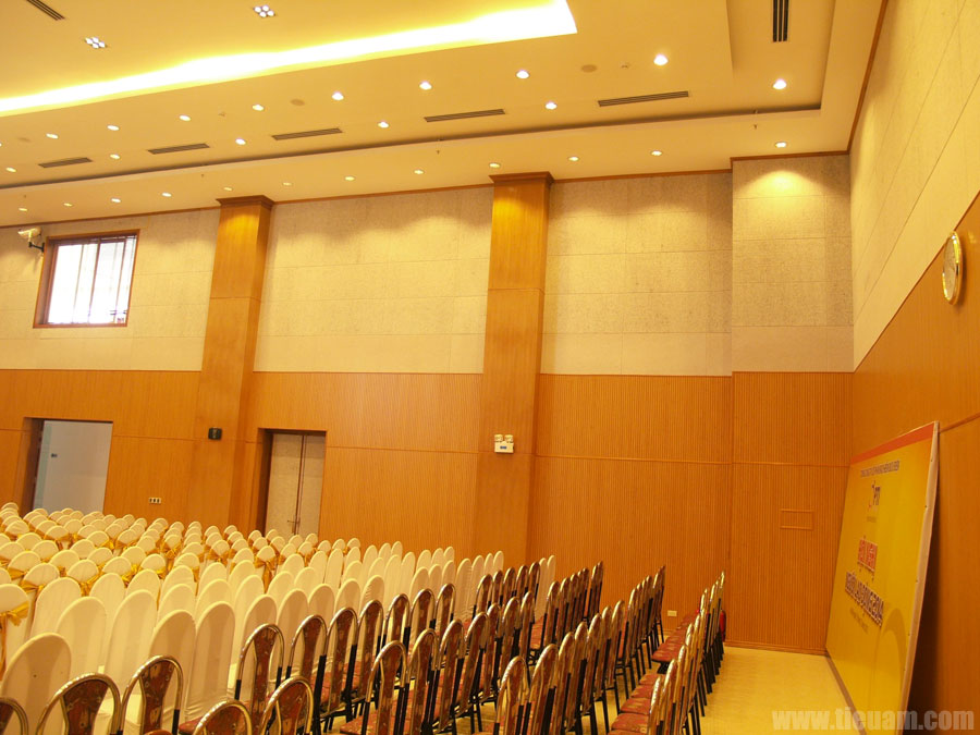 Vách hội trường được xử lý tiêu âm với gỗ tiêu âm Remak Linear 28/4 và t ấm tiêu âm Remak Sonic