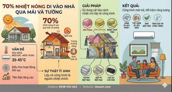 Chính vì vậy, trong thiết kế và thi công công trình hiện đại, các giải pháp vật liệu cách nhiệt chống nóng ngày càng được chú trọng. Việc sử dụng lớp vật liệu cách nhiệt phù hợp có thể giúp giảm đáng kể lượng nhiệt truyền vào công trình, đồng thời cải thiện hiệu quả sử dụng năng lượng.