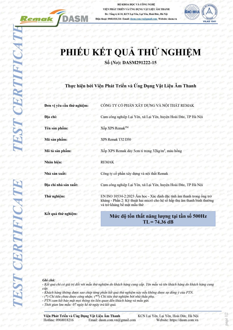 Chứng nhận từ Viện DASM, một trong những viện nghiên cứu uy tín tại Việt Nam, khẳng định chất lượng vượt trội của sản phẩm xốp XPS cách âm cách nhiệt mang thương hiệu Remak, làm cho nó trở thành sự lựa chọn ưu tiên cho các công trình yêu cầu tính cách âm cao.