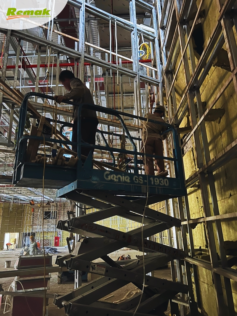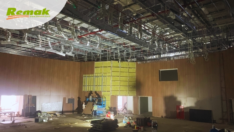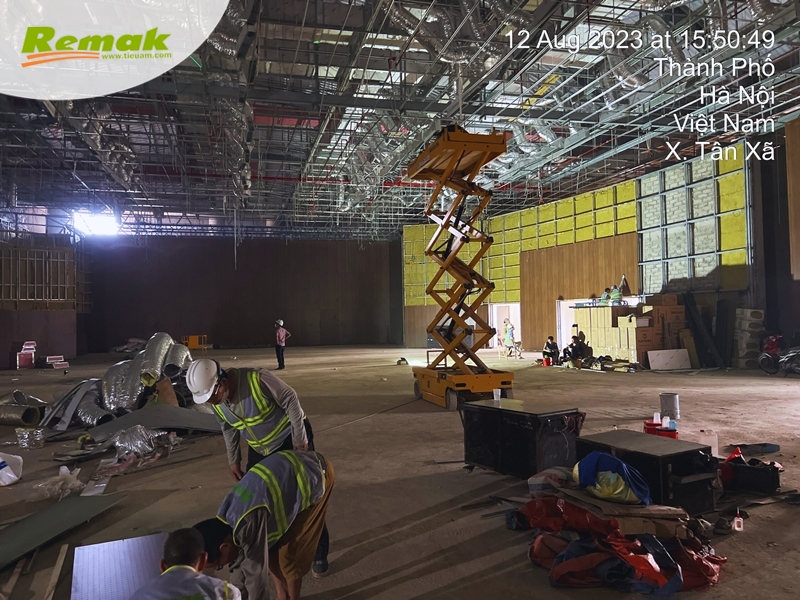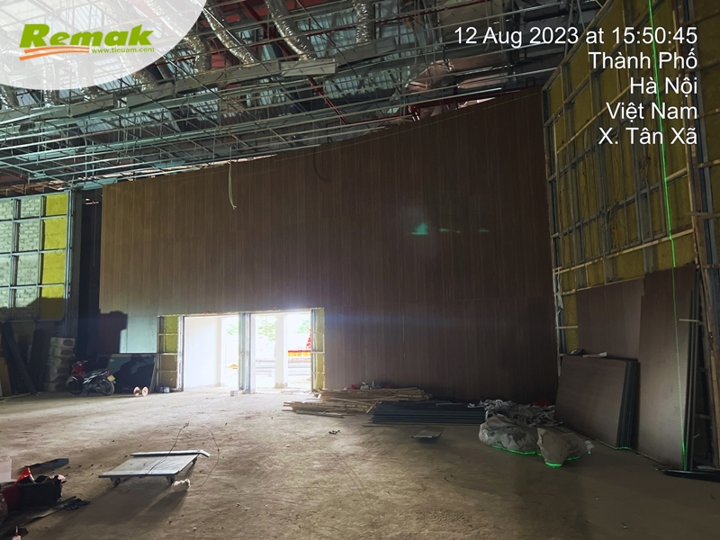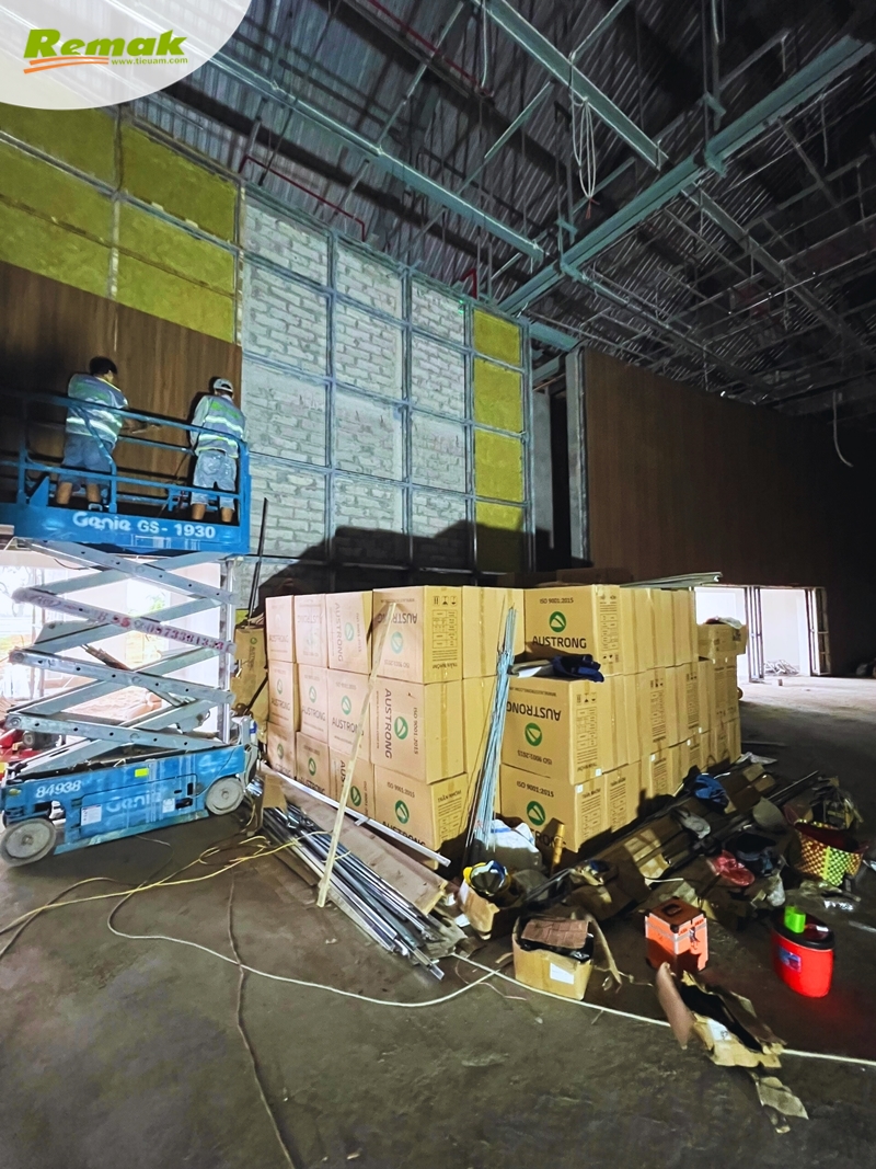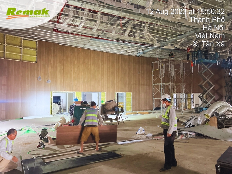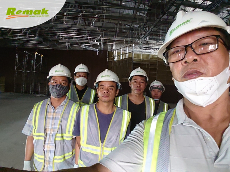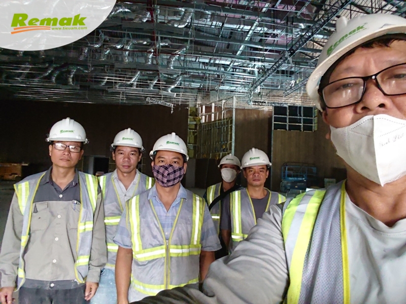 Chúng tôi đã gặp phải không ít khó khăn khi thi công vách gỗ tiêu âm cùng lúc với hạng mục thông gió, phòng cháy chữa cháy… của các nhà thầu khác. Tuy kéo đường điện riêng để chủ động và tiện dụng cho công việc, các Remaker vẫn vui vẻ san sẻ khi một số tổ thợ cùng làm tại công trường nhờ vả mặc dù điều này khiến mọi người phải hối hả chạy đua cùng thời gian để đảm bảo tiến độ thi công và chất lượng công trình. Thời tiết giao mùa khắc nghiệt, nắng nóng thất thường, ảnh hưởng từ mưa bão. Hiện trường sạt lở đất cát, xe vận tải bị sa lầy. Tình hình vận chuyển chậm lại do phải hạn chế dính nước vào vật liệu… v.v ... Muôn nỗi vất vả ướt đầm mồ hôi khắp áo bảo hộ xanh màu logo thương hiệu cũng không thể ngăn nổi tinh thần làm việc miệt mài cần mẫn và những nụ cười hồn hậu thân thiện của đội thi công Remak.