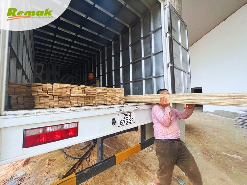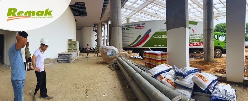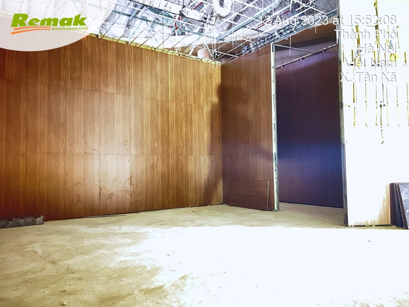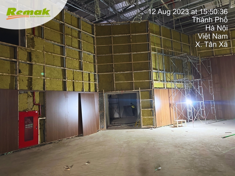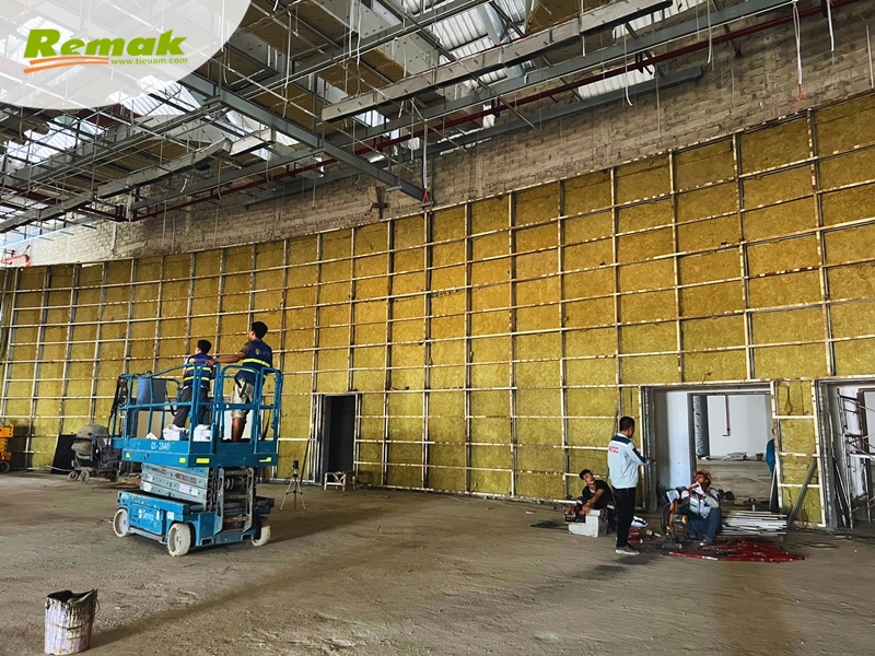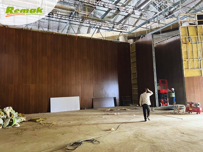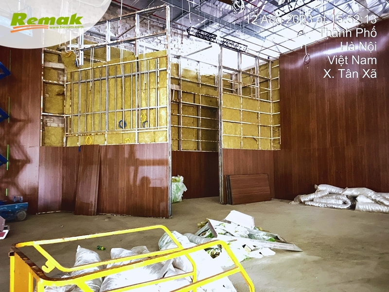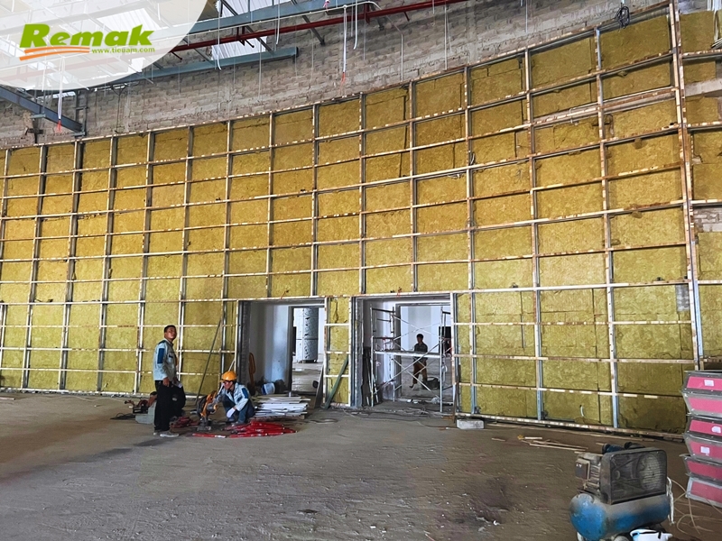 Chúng tôi đã gặp phải không ít khó khăn khi thi công vách gỗ tiêu âm cùng lúc với hạng mục thông gió, phòng cháy chữa cháy… của các nhà thầu khác. Tuy kéo đường điện riêng để chủ động và tiện dụng cho công việc, các Remaker vẫn vui vẻ san sẻ khi một số tổ thợ cùng làm tại công trường nhờ vả mặc dù điều này khiến mọi người phải hối hả chạy đua cùng thời gian để đảm bảo tiến độ thi công và chất lượng công trình. Thời tiết giao mùa khắc nghiệt, nắng nóng thất thường, ảnh hưởng từ mưa bão. Hiện trường sạt lở đất cát, xe vận tải bị sa lầy. Tình hình vận chuyển chậm lại do phải hạn chế dính nước vào vật liệu… v.v ... Muôn nỗi vất vả ướt đầm mồ hôi khắp áo bảo hộ xanh màu logo thương hiệu cũng không thể ngăn nổi tinh thần làm việc miệt mài cần mẫn và những nụ cười hồn hậu thân thiện của đội thi công Remak.