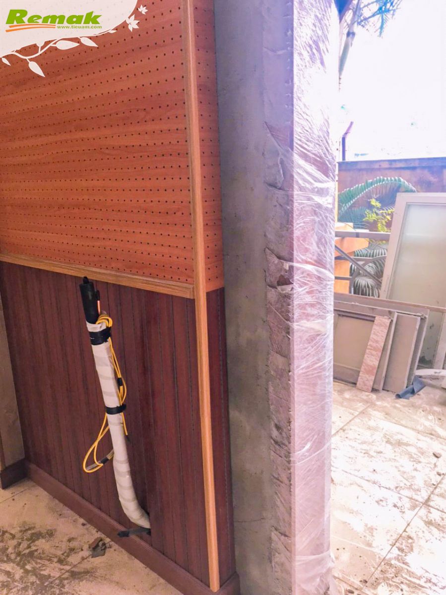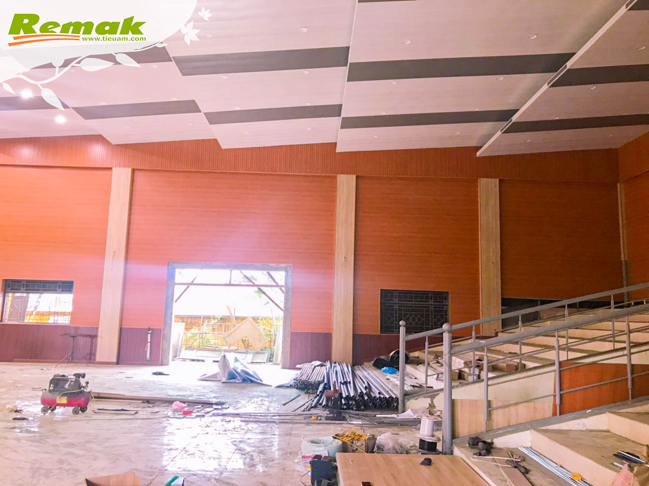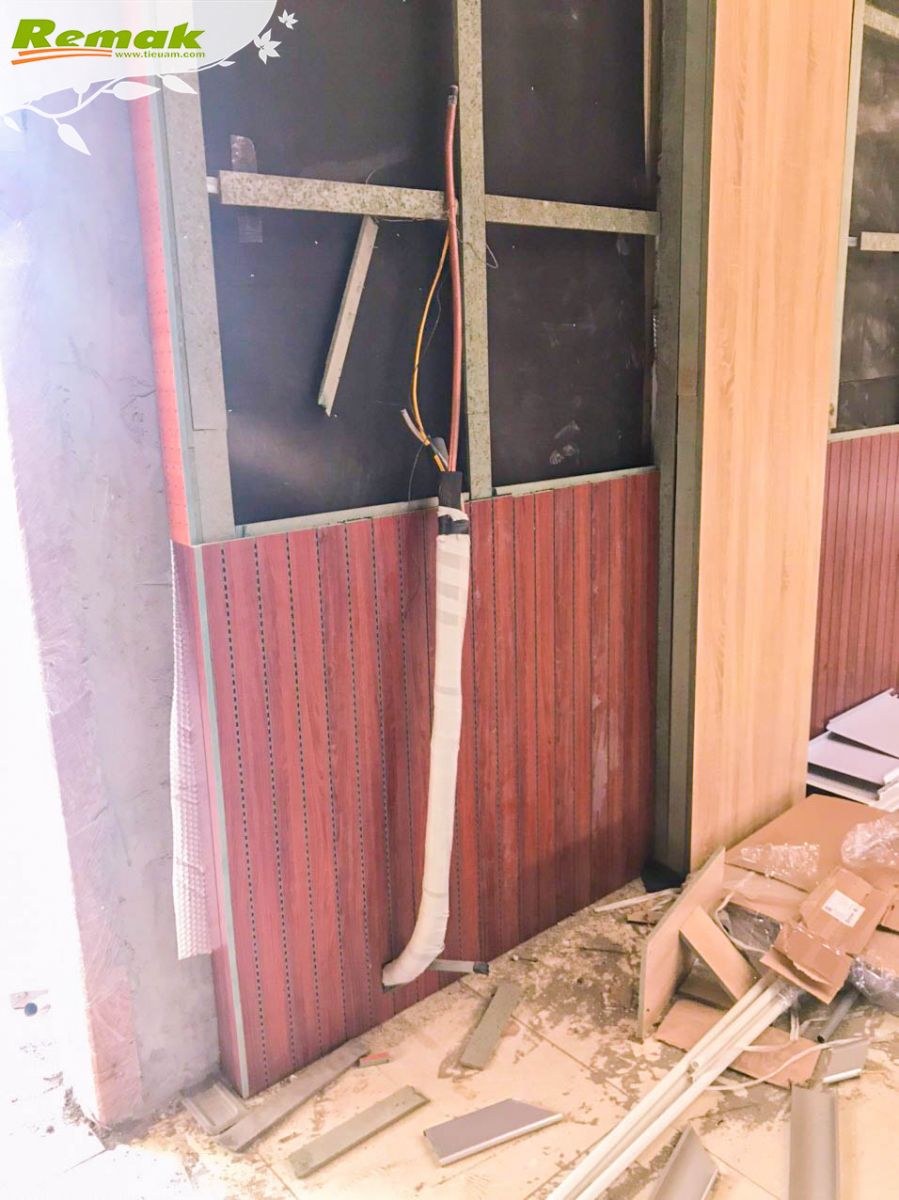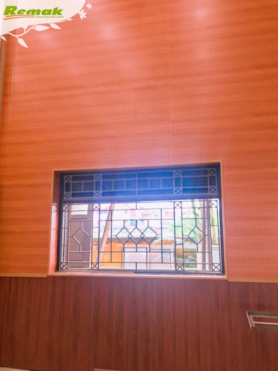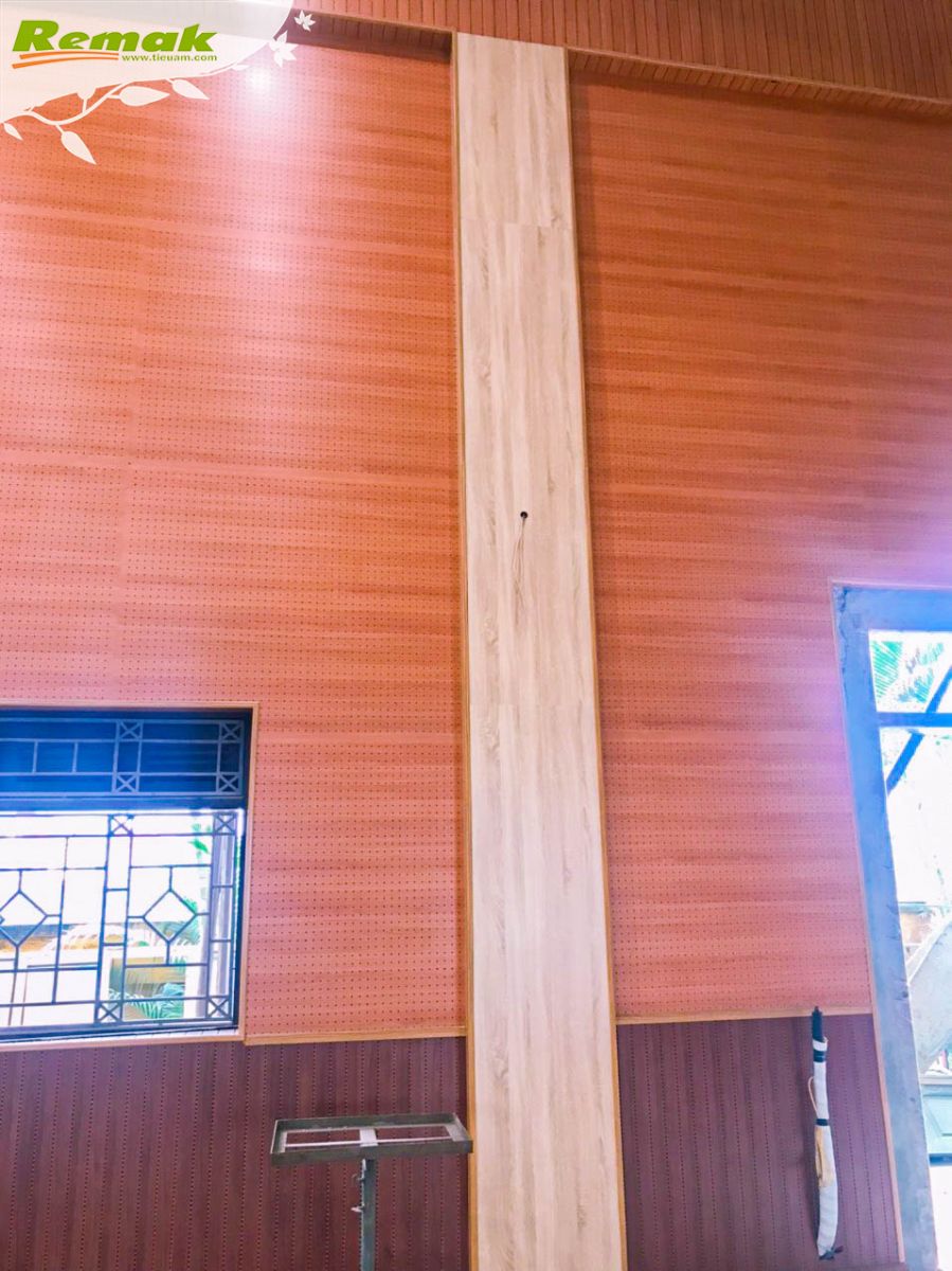 Chùm ảnh dưới đây ghi lại hiện trường hội trường UBND xã Cửu Cao, huyện Văn Giang, tỉnh Hưng Yên sử dụng gỗ tiêu âm đục lỗ Remak® Perforated, gỗ tiêu âm soi rãnh Remak® Linear và cao su non Remak® Sound OFF Damping Rubber để thi công tiêu âm vào cuối tháng 4/2023.