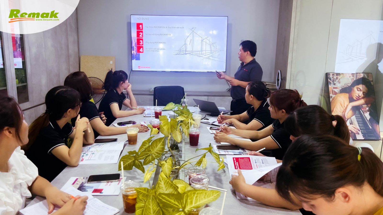 Chiều 31/8, Chuyên viên Văn phòng đại diện tại Việt Nam ROCKWOOL (Thailand) Limited Nguyễn Tuấn Anh thực hiện buổi đào tạo – chia sẻ lý thú về các dòng sản phẩm bông khoáng ROCKWOOL đi kèm ứng dụng đa dạng; đối sánh trực quan đặc tính cách nhiệt, cách âm, chống cháy nổi trội so với những vật liệu cùng loại khác; kỹ thuật thi công; giải pháp cho toàn bộ lớp vỏ tòa nhà, các ngành công nghiệp nặng cũng như các công trình dân dụng, thương mại... v.v...