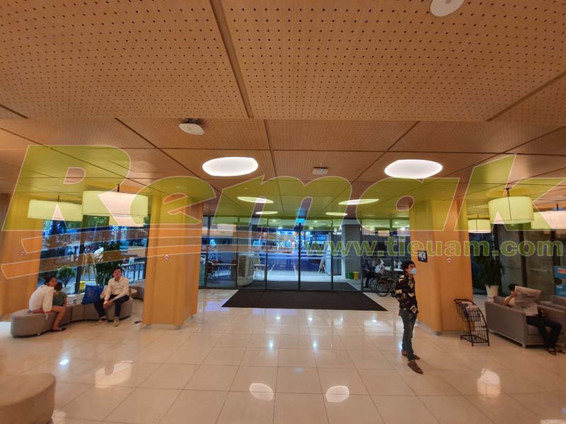 + Xử lý cách âm trần bằng bông khoáng, bông thủy tinh kết hợp với gỗ tiêu âm ốp trần hoặc các tấm tiêu âm sonic treo trần
