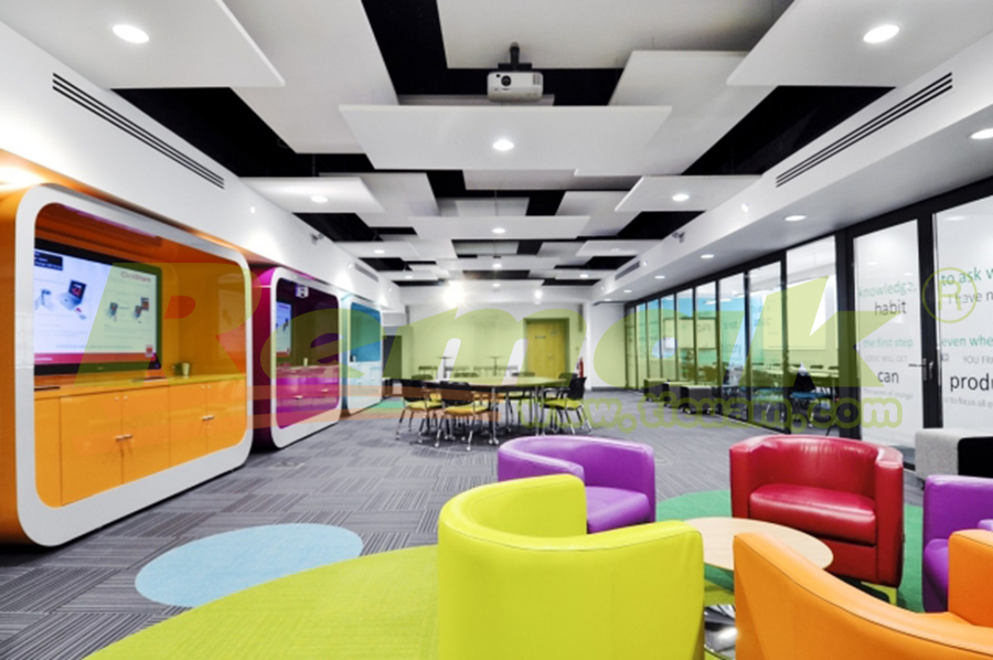Bên cạnh đó, sử dụng các tấm panel tiêu âm treo trần dạng đám mây màu sắc cũng là giải pháp tiêu âm, trang trí được nhiều văn phòng yêu thích.